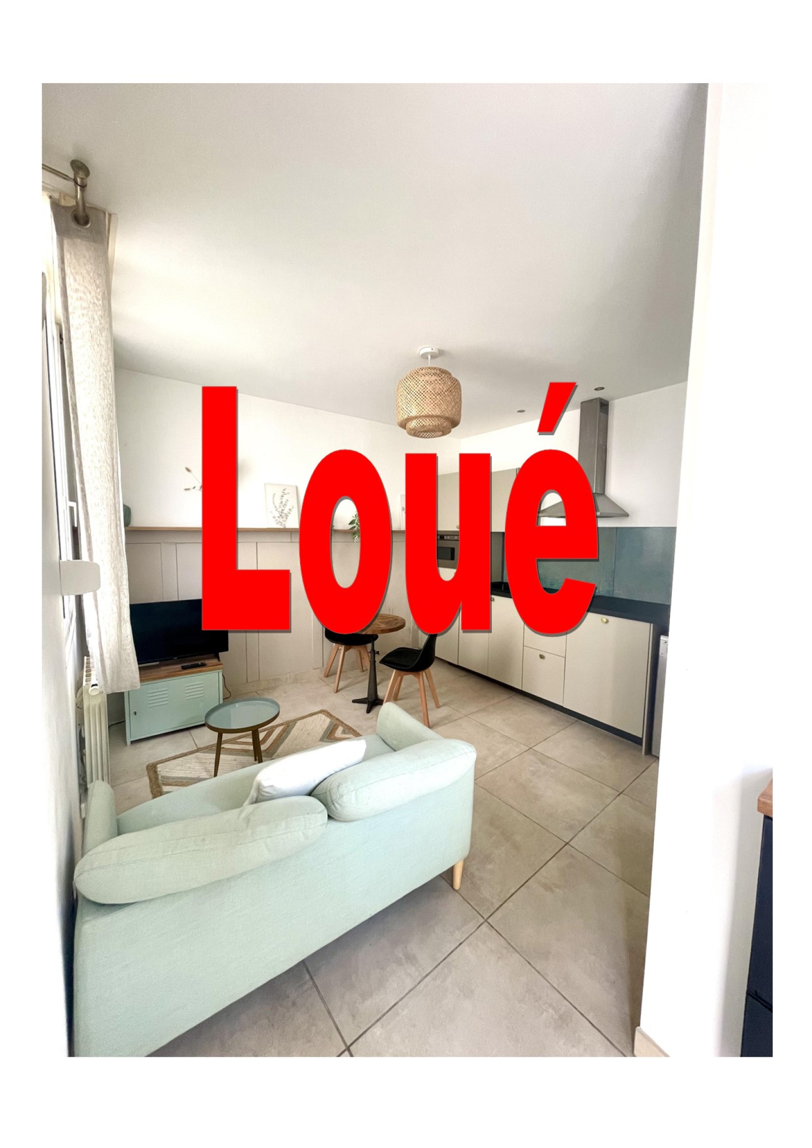 Entrée sur pièce de vie avec cuisine aménagée et équipée.