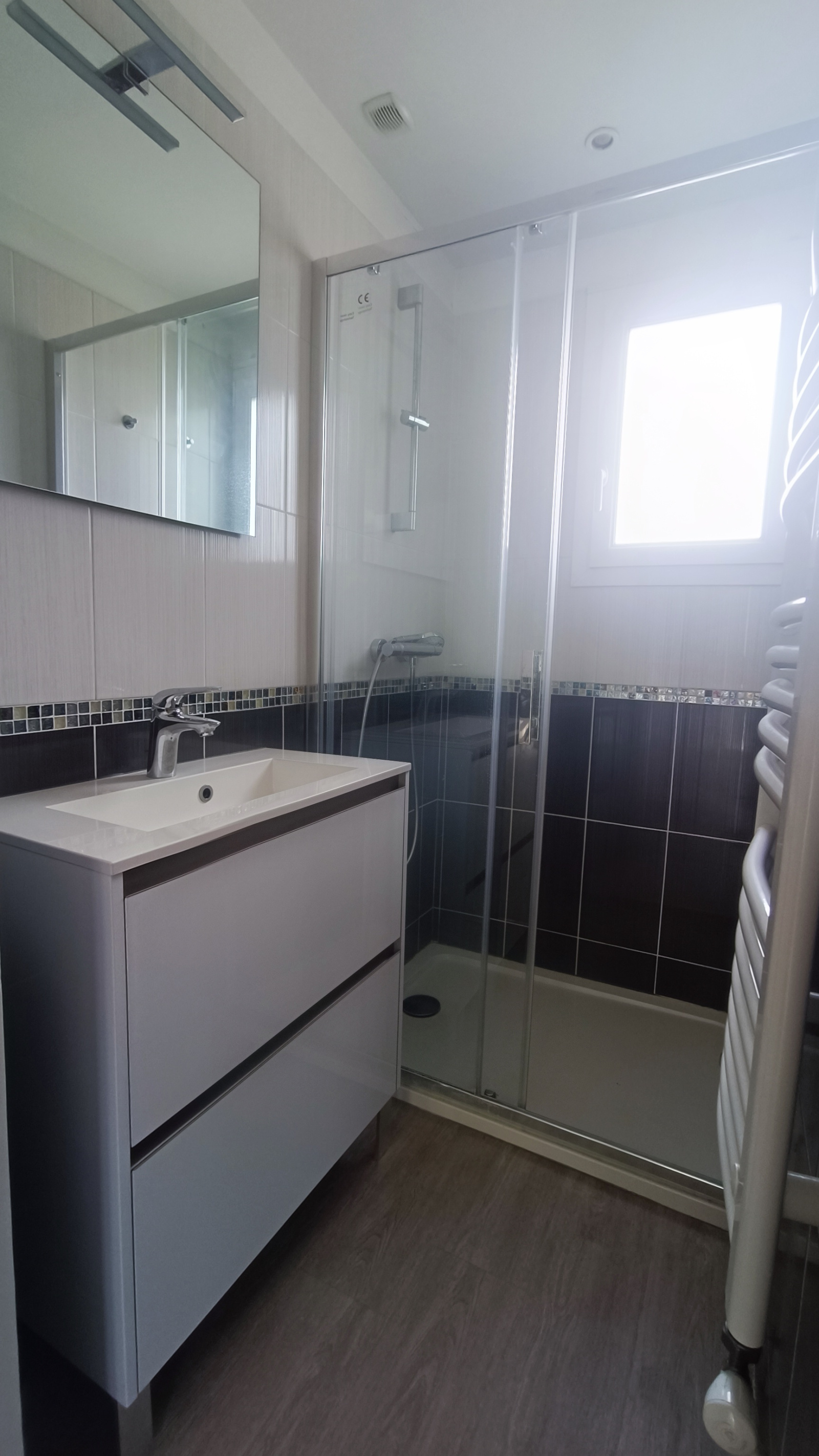 Entrée, cuisine semi-équipée séparée, salon-séjour, salle d'eau, WC et deux chambres