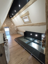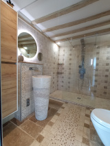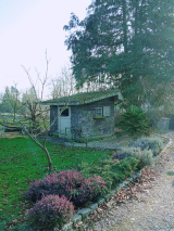 AU REZ-DE-CHAUSSEE : ENTREE DONNANT SUR UNE CUISINE AMENAGEE ET EQUIPEE, SEJOUR / SALLE A MANGER AVEC POELE A BOIS, SALON OU CHAMBRE, SALLE DE DOUCHE A L'ITALIENNE AVEC WC ;