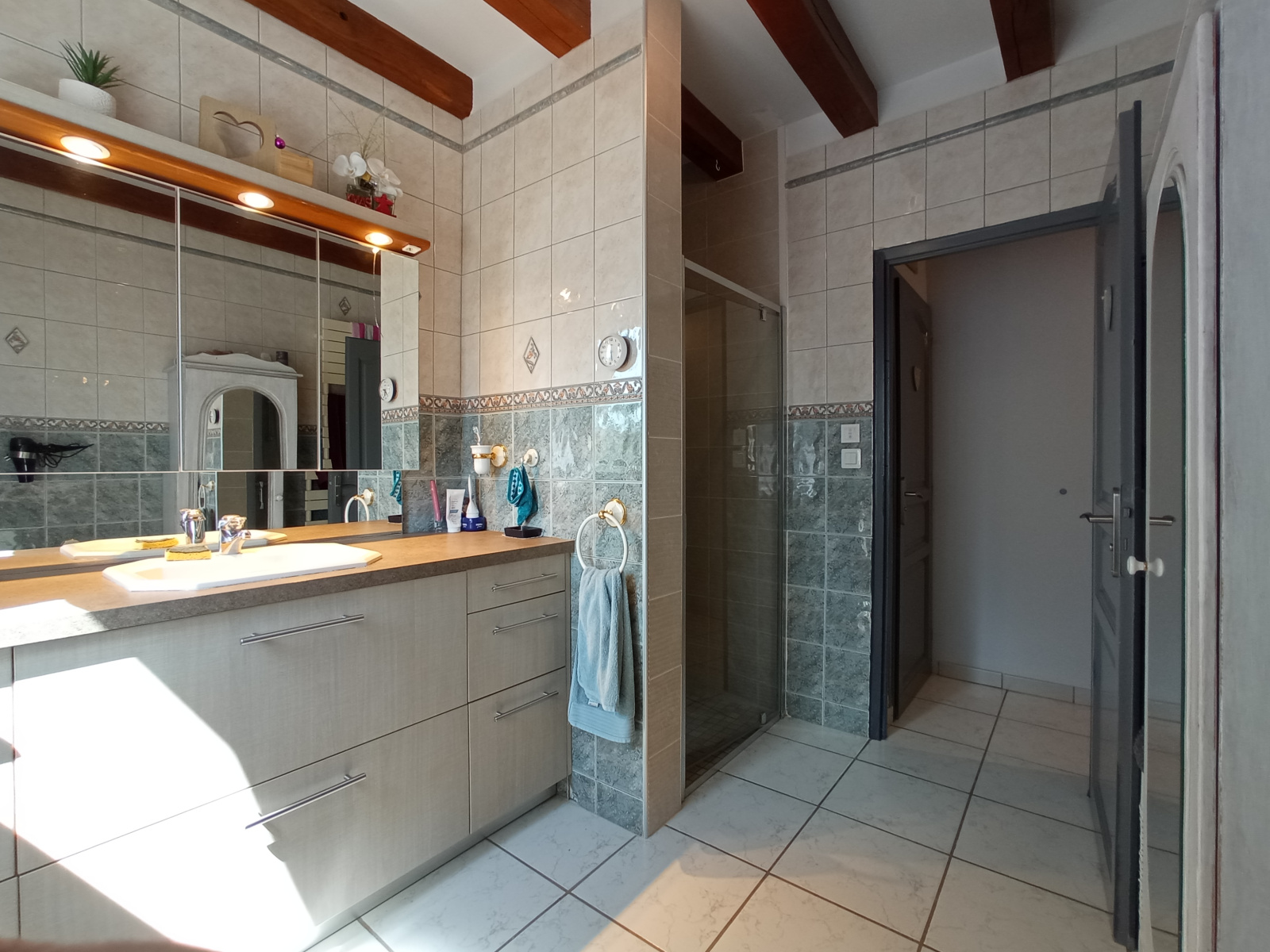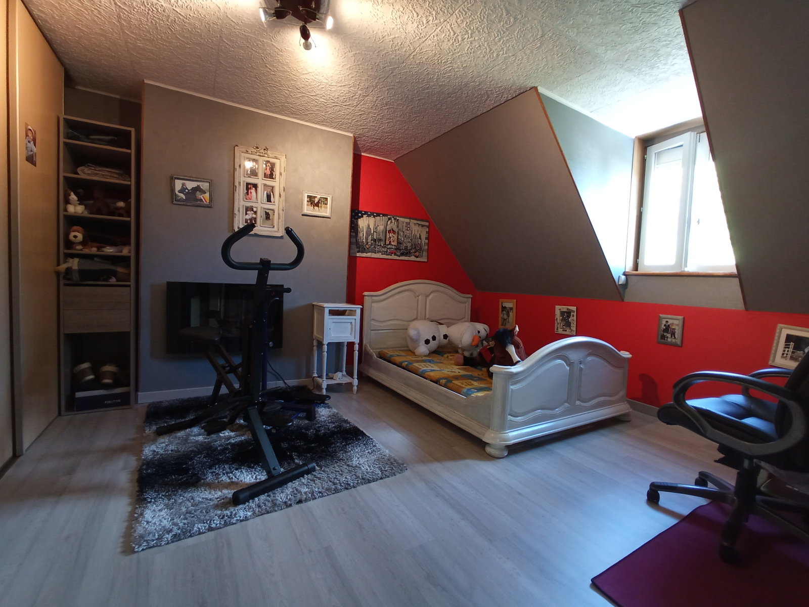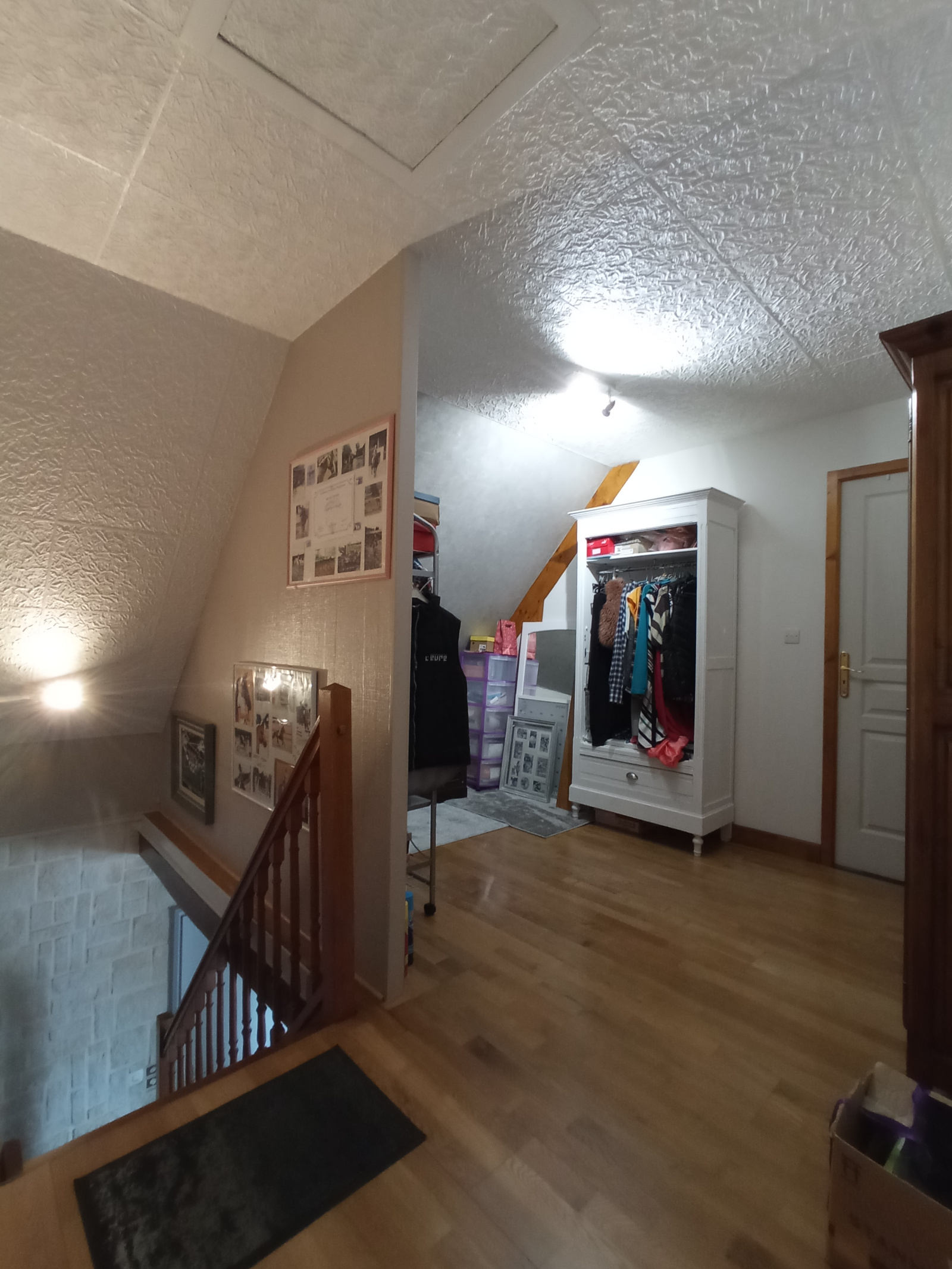 A L'ETAGE : PIECE PALIERE A USAGE DE BUREAU DESSERVANT 2 CHAMBRES DONT UNE AVEC PLACARD ET UNE AVEC DRESSING, SALLE DE BAINS AVEC WC A TERMINER ;