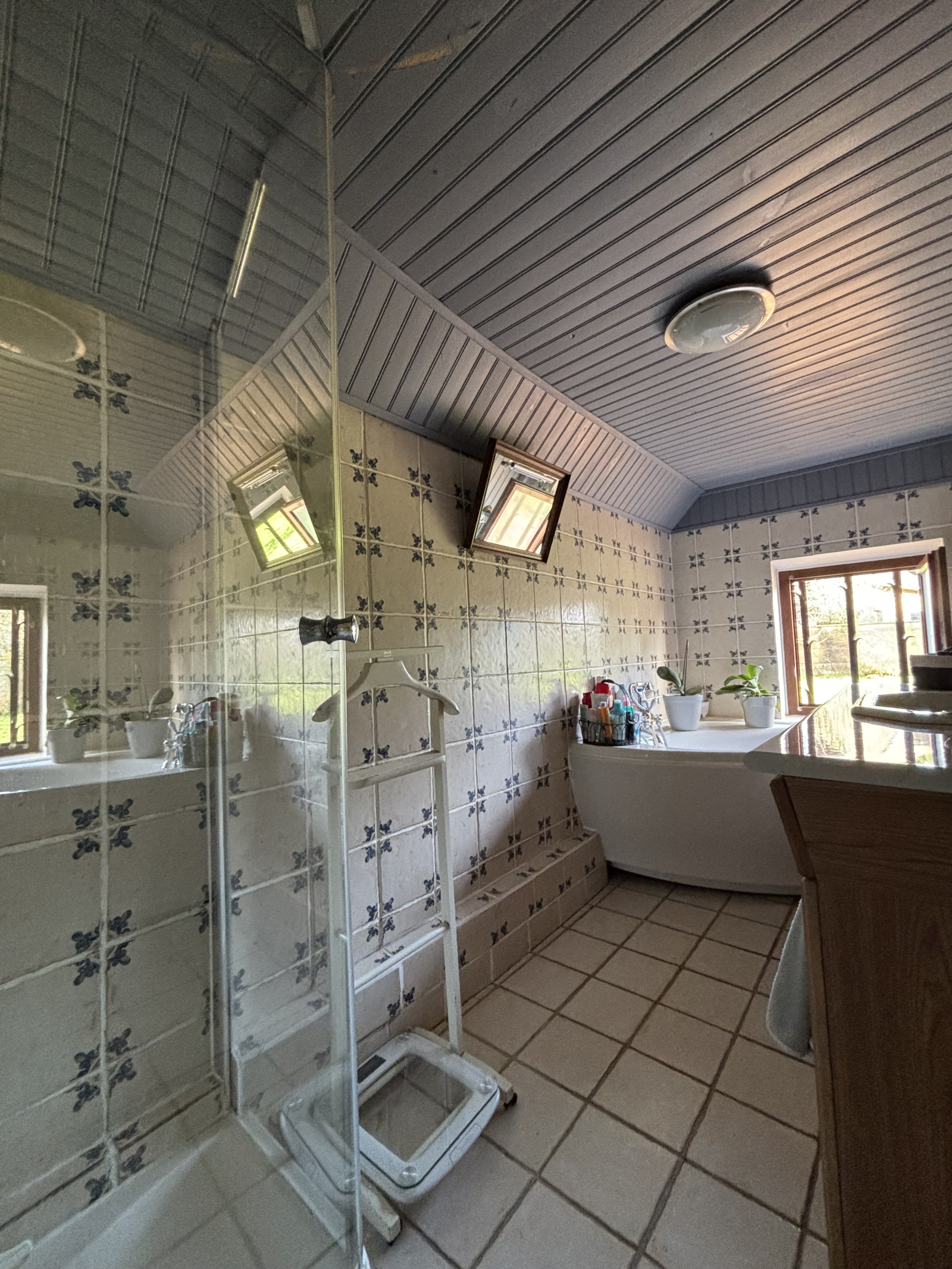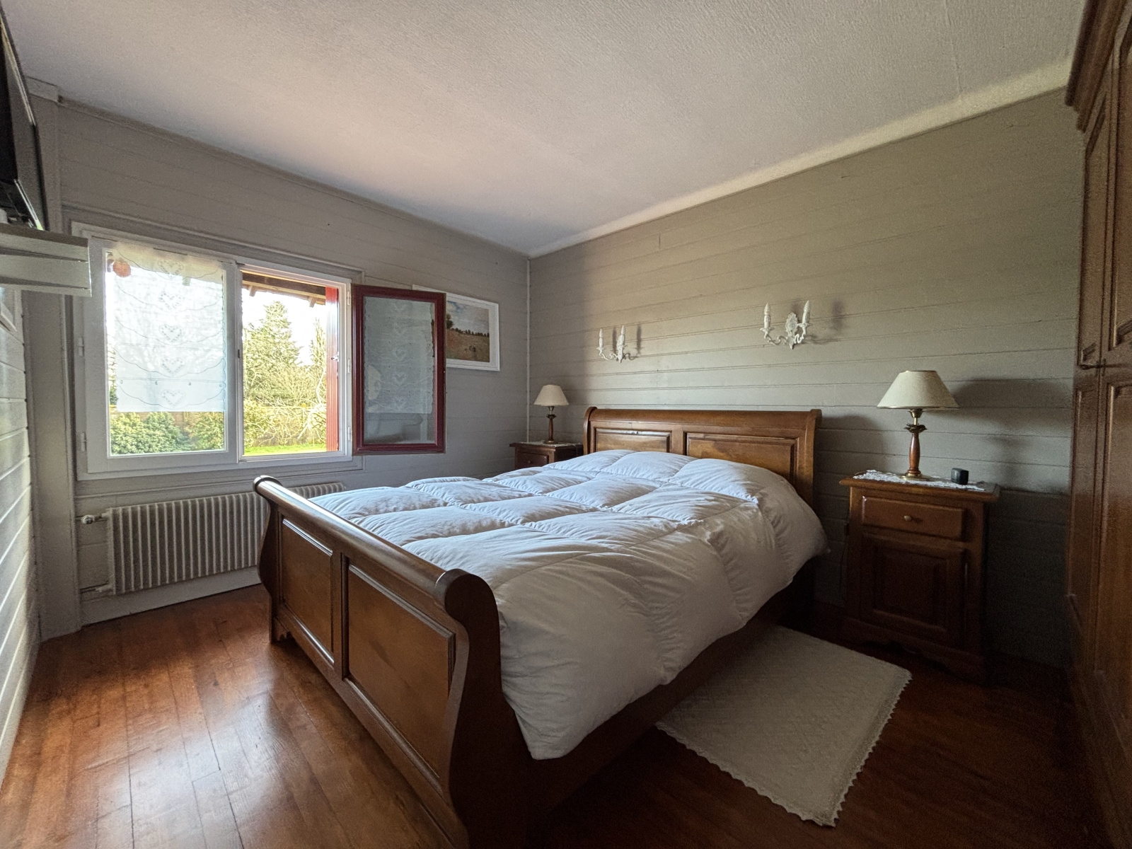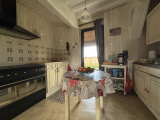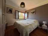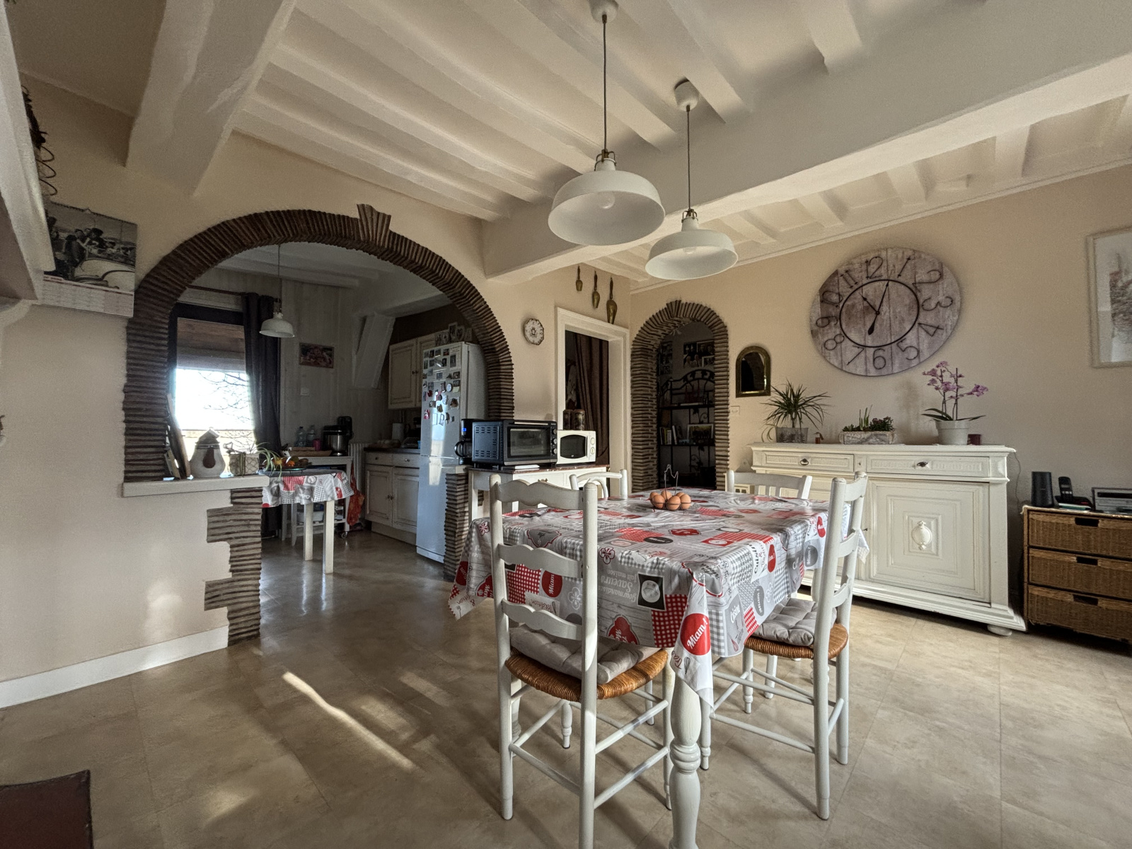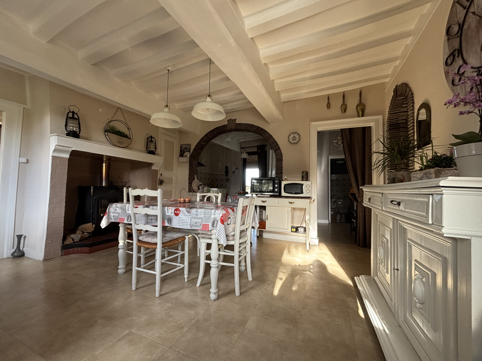 Entrée donnnant sur la cuisine améangée et équipée avec un poele à bois, salon/séjour avec cheminée foyer ouvert, deux chambres, une salle de bains mixte avec wc. Lingerie/buanderie accès extérieur. Grenier aménageable.