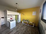 Cette maison comprend au rez-de-chaussée : une entrée avec un grand dressing, une pièce de vie lumineuse avec sa cuisine aménagée et équipée, une chambre et une pièce de 21m2 pouvant faire office de bureau/chambre et un WC.