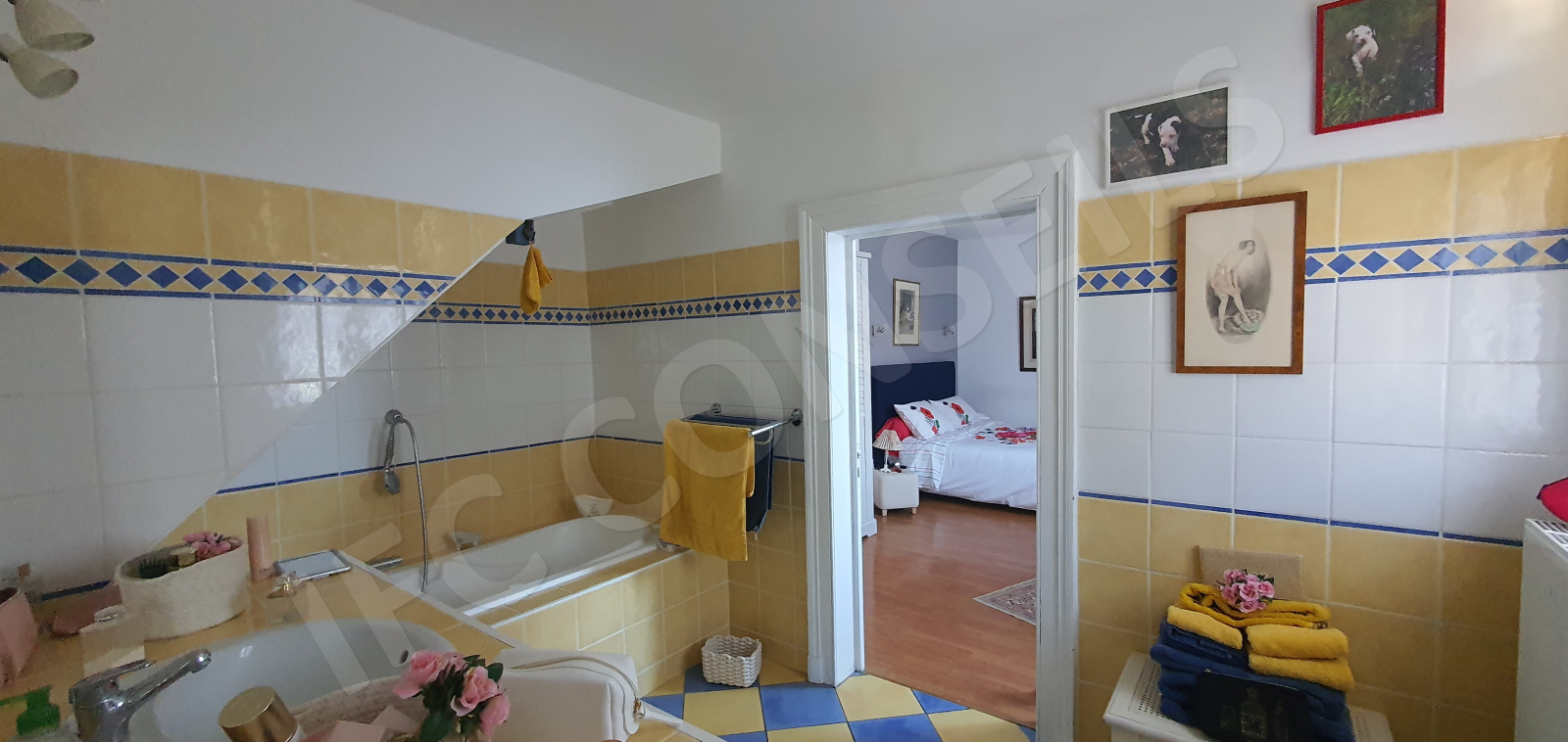 coin repas, un beau séjour lumineux avec sa cheminée ouverte ainsi qu'une suite parentale de 22.65 m² comprenant une salle de bain de 5.43 m²